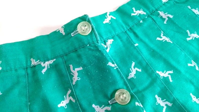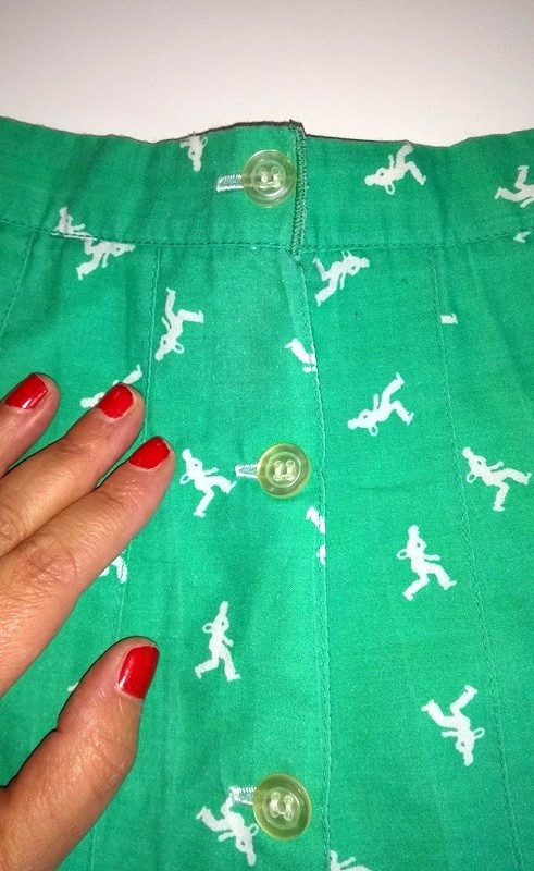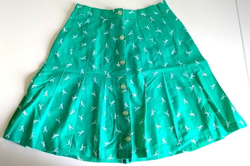 Petite jupe plissée couleur vert clair, décorée par de petits bonhommes blancs ! Elle se ferme sur le devant par 6 boutons, coté état, elle est juste légèrement boulochée sur le devant, juste en dessous de la taille, mais cela n’est pas bien méchant ! Sur l’étiquette, il est noté 38… Mais je ne sais pas si j’ai la berlue, je fais une taille 36 et là on est clairement au 34 !! N’hésitez pas à nous contacter !! 😉